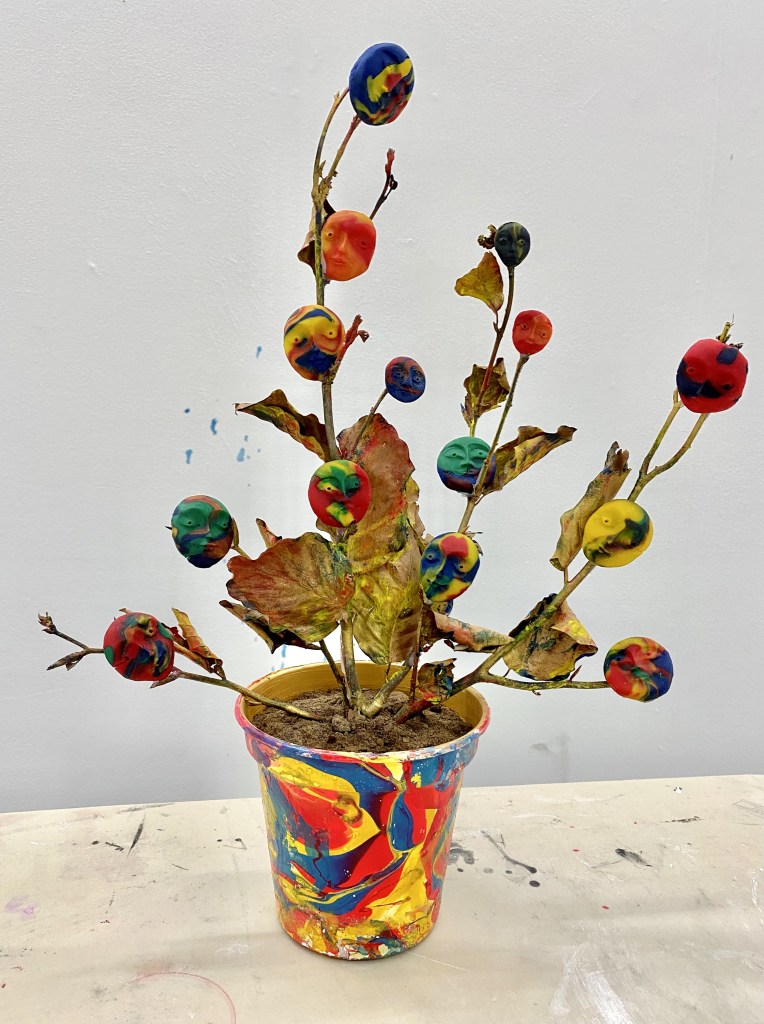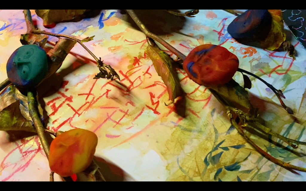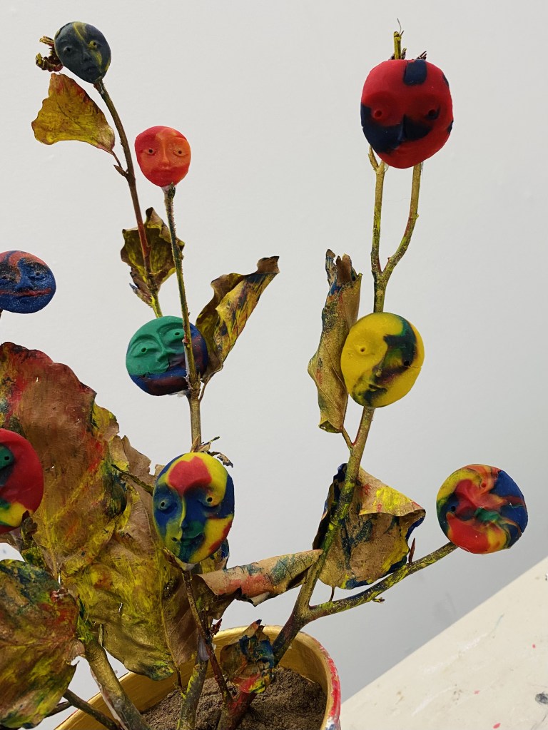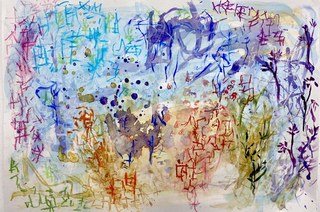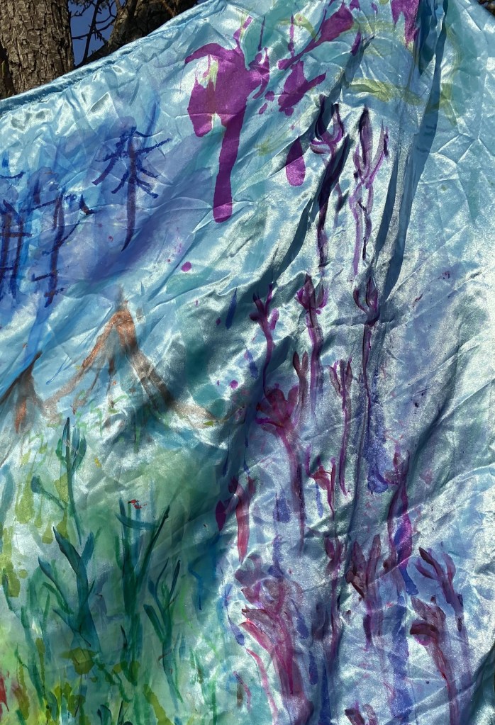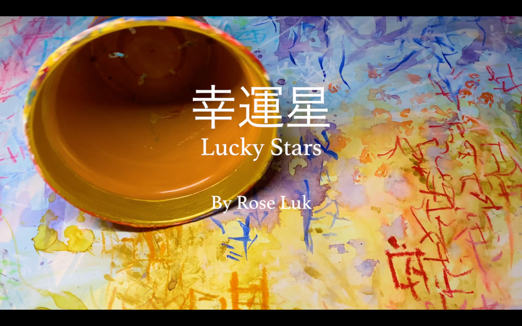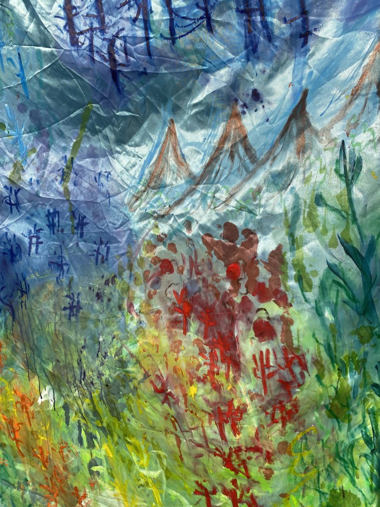 My experimental paintings ‘幸運星 Lucky Stars’ explore my mixed raced identity and Chinese heritage and what Chinese sounds like to me from a non-speaking perspective listening to my father’s favourite classic Cantonese song by Michael Kwan. The abstract sensory map celebrates my individuality and my family heritage by thinking through materials, colours, forms, and rhythm to make meaning of my inner world and experience as a mixed-race British Chinese woman. Creating my own visual language through mark making to make sense of a languages I have grown up detached to but feel a great closeness with. The colours signify flavours and the atmosphere I experience when I immerse myself, while the gesture inhabits movement from rhythm and the heat of spices in hot tea from China, India, and Finland. I exhibited the dazzling blue satin and colours at their brightest by hanging it from a blossom tree which was very calming to watch wave peacefully in the wind.