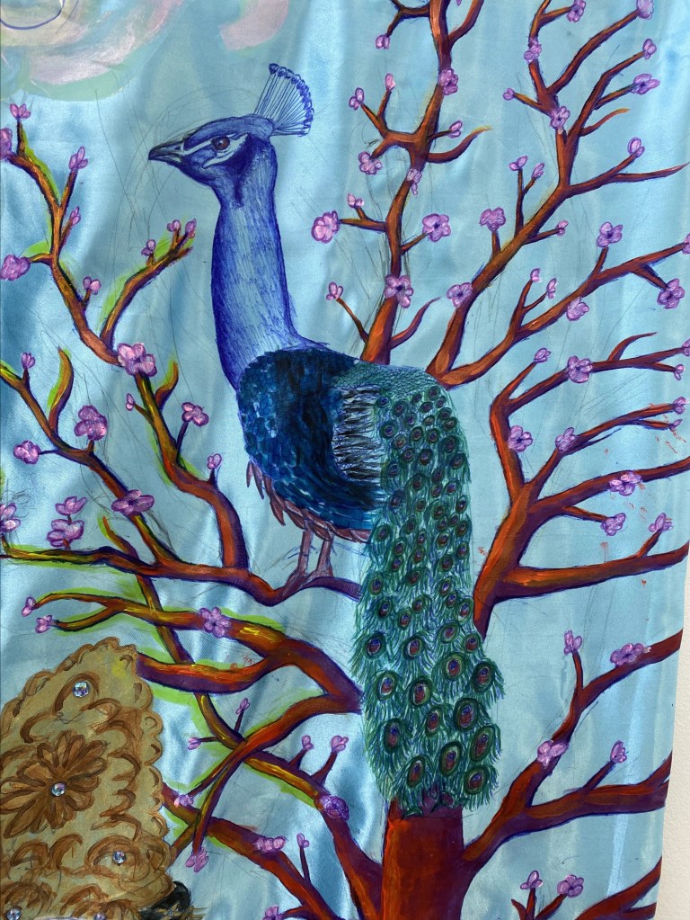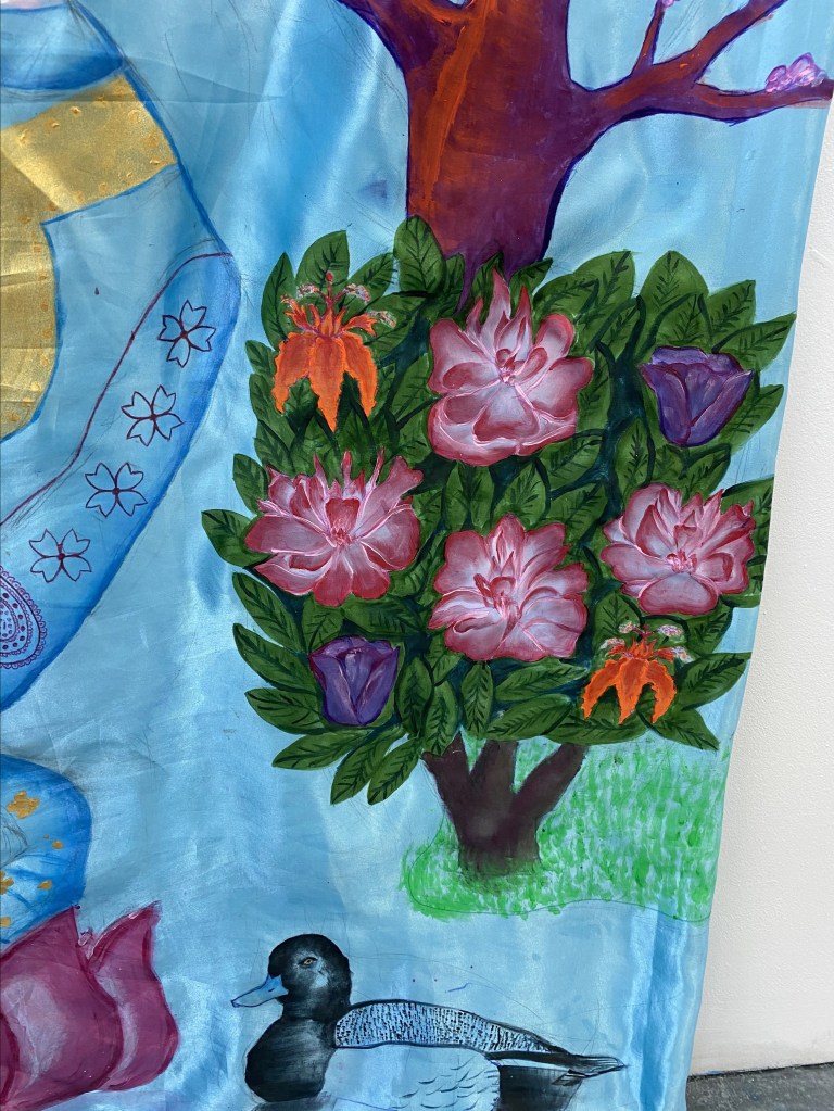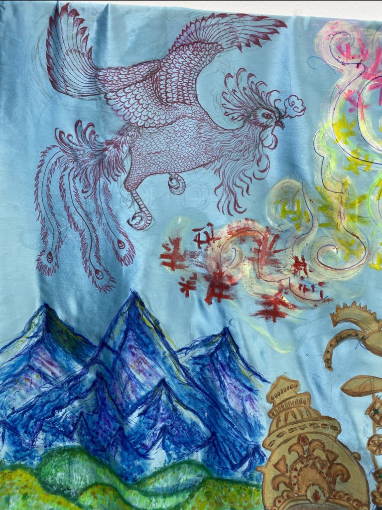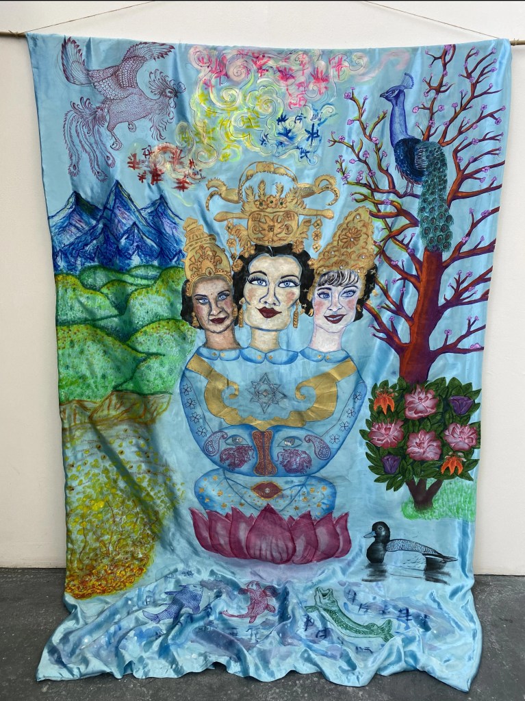 My satin wall hanging artwork has a dazzling material quality – discovered originally in china, the sky/sea blue reflects the immensity of the divine universe and my identity. I was motivated by the fact I had grown up very distant from heritage, so I took the initiative to educate myself in the matter. This was my chance to change my personal narrative of displacement and confusion into curiosity; celebrating the wonders of each culture. I had the idea to create a cross-cultural piece that would amalgamate the three parts of my mixed race identity (Chinese, Finnish, Indian) through the symbolism of nature, mythology, religion, and spirituality. This lead me discover Indian Gods such as the three headed God calledBrahma because my artwork surrounds the creation of life. I wanted to combine this ideology with three important women from each culture that I yearn familiarise with – my grandmothers and aunts. I reimagined them as empresses combined into my own goddess surrounded by a cross-cultural mythical scenery.